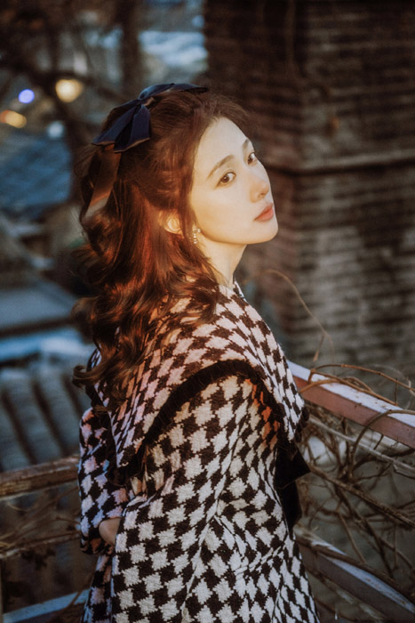 杨欣颖黑白格纹连衣裙时尚甜美写真照