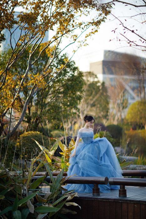 祝绪丹蓝色一字肩纱裙优雅写真照