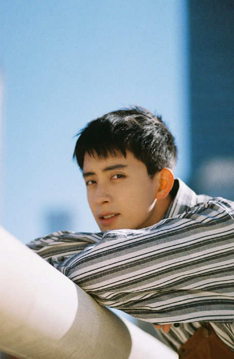敖瑞鹏条纹衬衫背带裤阳光清新户外写真照